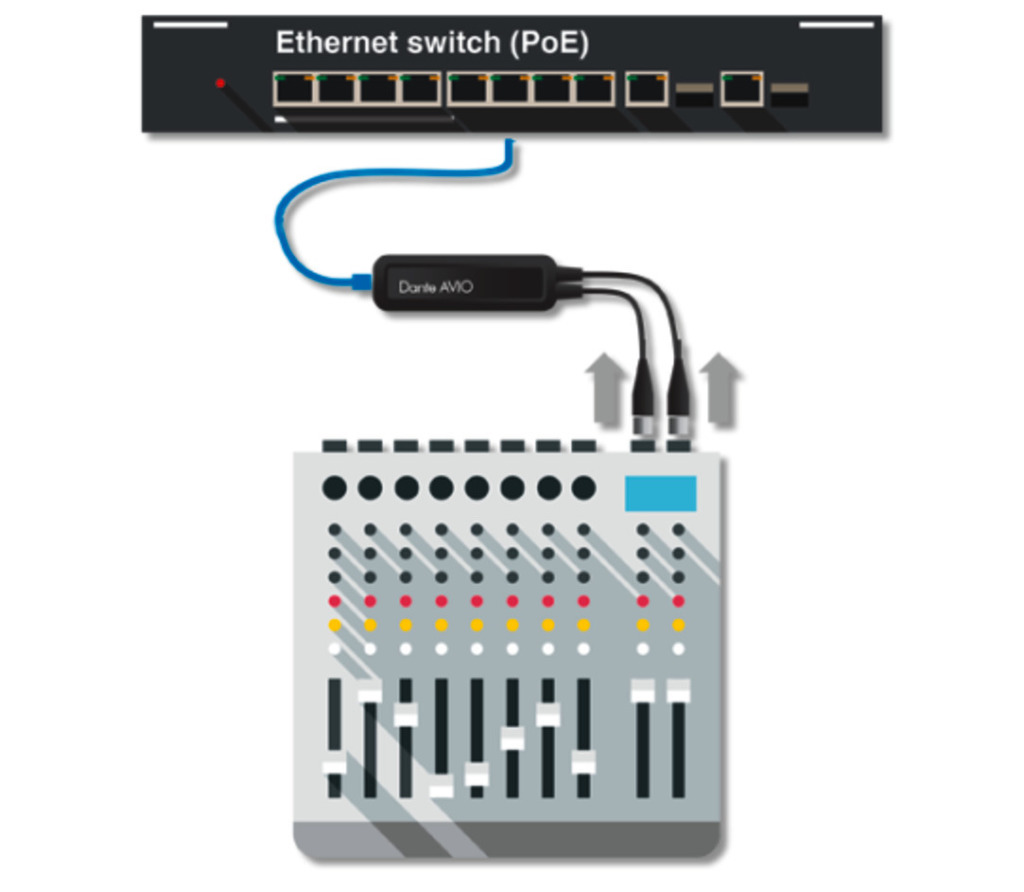 - Für den Anschluss von analogen Audio-Line-Level-Geräten (z. B. Mischpult) an ein Dante®-Audio-Netzwerk