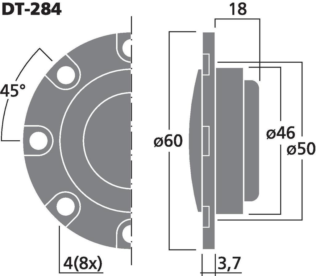 DT-284 "The Dome''. Dieser Hochtöner stellt alles zur Verfügung, was man von einem Top-Class-Tweeter erwartet: ein sensationell linearer Frequenzgang, hohe Pegelreserven, tiefe Ankopplung, kompakte Abmessungen und ein attraktives, unverwechselbares Design!
