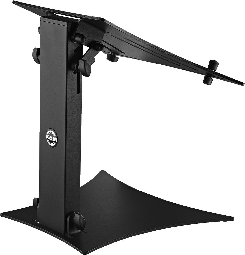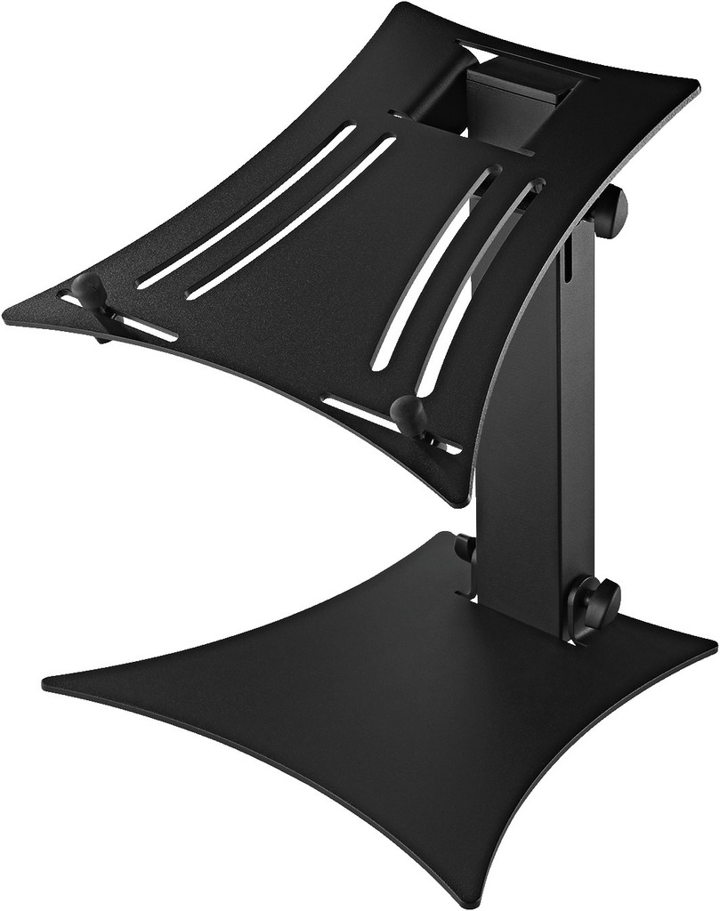 - Individuell einstellbare Anschlagstifte mit Gummikappen für die Montage von gängigen Laptop-Modellen oder Mischpulten, CD-Playern