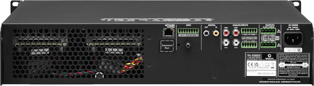 - 4 Ausgänge (4/8 Ω) oder 2 Zonen-Ausgänge (100 V) über Schraub-/Steckverbindung
