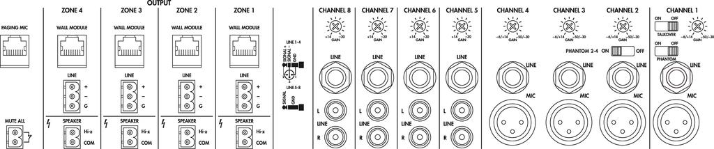 - 4 regelbare Mic/Line-Eingänge mit 3-fach-Klangregelung und zuschaltbarer 24-V-Phantomspeisung
