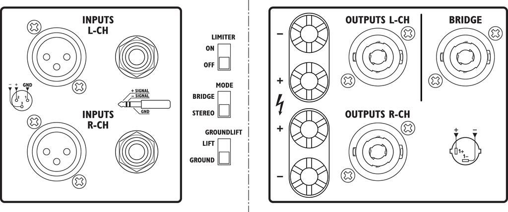 - 2 Betriebsarten einstellbar (Stereo oder Brücke)