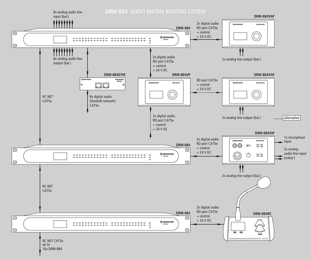 Erweitern Sie die Möglichkeiten Ihres Matrix-Systems: Wird eine größere Anzahl an Ein- und Ausgängen benötigt, können Sie das System mittels Kaskadierung von max. 16 DRM-884 und optionalem Dante®-Modul auf bis zu 192 Eingänge x 192 Ausgänge erweitern.