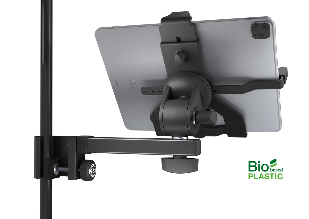 Universeller Tablet-Halter mit einer praktischen Klemmmechanik für alle Tablets mit einer Größe von ca. 254-406 mm (10"-16"). Die Tablet-Halterung ist aus biobasiertem Kunststoff gefertigt. Diese Kunststoffe enthalten einen Anteil von über 50% bis zu 100% an nachwachsenden pflanzlichen Rohstoffen. Der Klemmbereich des Tablet-PC-Halters liegt zwischen 158 und 280 mm. Besonders geeignet ist der Halter auch für den Einsatz von Tablets mit Schutzhülle oder Case bis zu einer Stärke von 20 mm. Die übergreifenden Klemmbacken mit integrierter Gummiauflage garantieren einen sicheren Halt und eliminieren unerwünschte Vibrationsgeräusche. Die Funktion der Bedienungselemente am Gerät wird dabei nicht beeinträchtigt. Ein verstellbarer Haltewinkel mit Filzauflage sorgt für zusätzliche Sicherheit bei vertikaler Ausrichtung des Tablet-Halters, sodass ein Herausfallen des Tablet-PCs selbst bei hoher Beanspruchung verhindert wird. Der Halter ist schwenkbar und neigbar und ermöglicht jedem Anwender seine individuelle Positionierung. Die Schwenkbewegung ist über eine Klemmschraube von leicht- bis schwergängig einstellbar. Selbstverständlich kann der Tablet-Halter zwischen Hoch- und Querformat kurzerhand gedreht werden, wobei ein selbstständiges Drehen verhindert wird. Der Haltearm mit Klemmprisma ist zum Anklemmen an Rohrdurchmesser bis 30 mm geeignet.