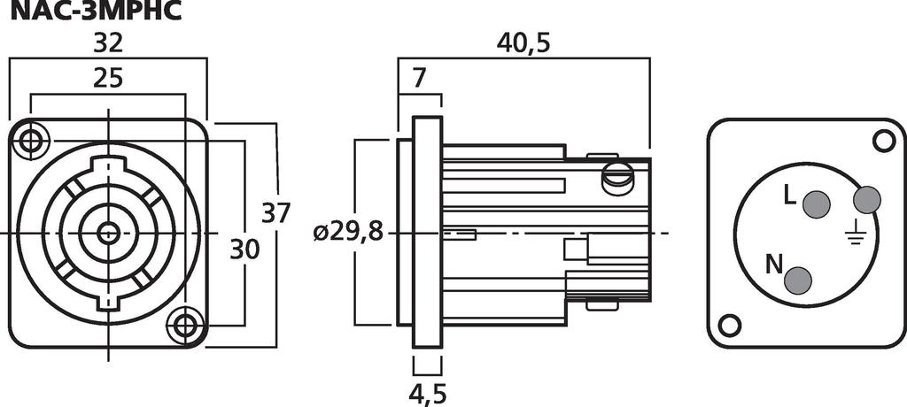 - Für den Netzanschluss mit hoher Strombelastbarkeit bis ˜ 250 V/32 A