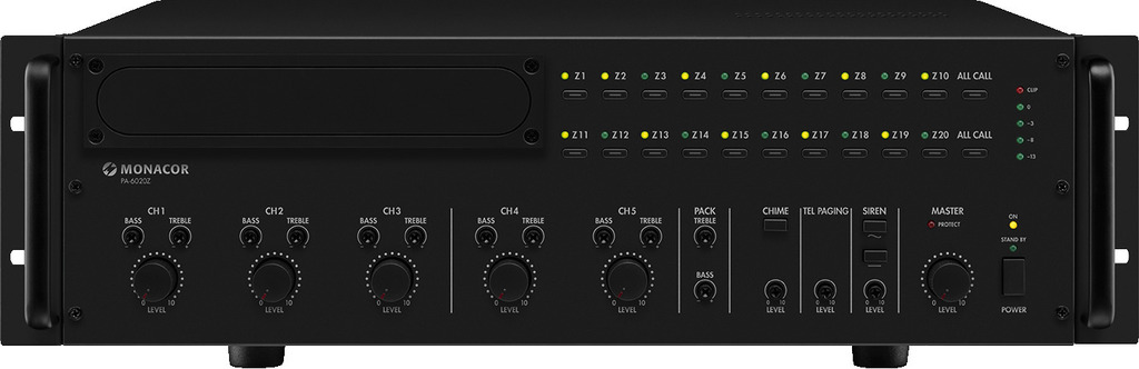 - 6 Speicher direkt über Tasten am Gerät, über potentialfreie Kontakte oder per Kommandomikrofon PA-1120RC bzw. PA-6000RC abrufbar