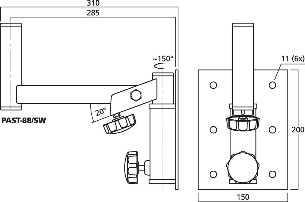 - Schwenkbar (ca. 150°) und neigbar (ca. 20°), mit Feststellschrauben arretierbar