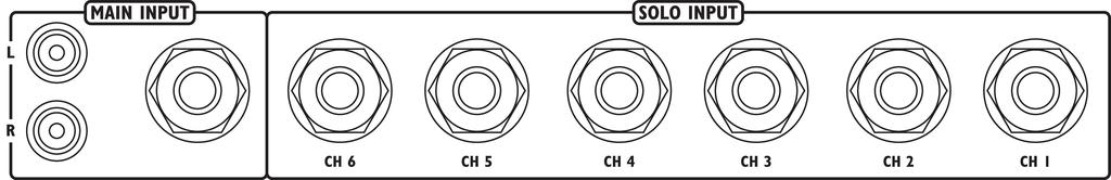 - Eingänge: Solo (stereo) 6 x 6,3-mm-Klinke, Main (stereo) 2 x 6,3-mm-Klinke, 2 x Cinch L/R